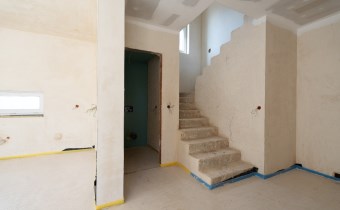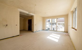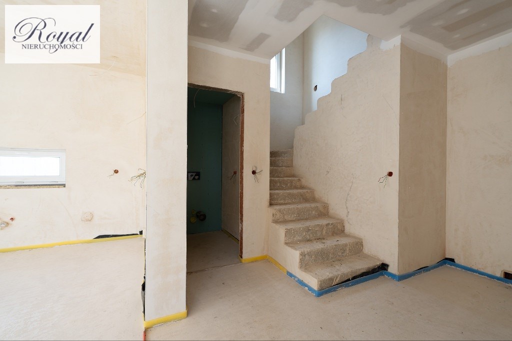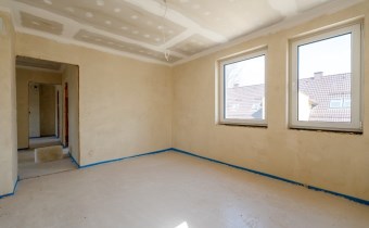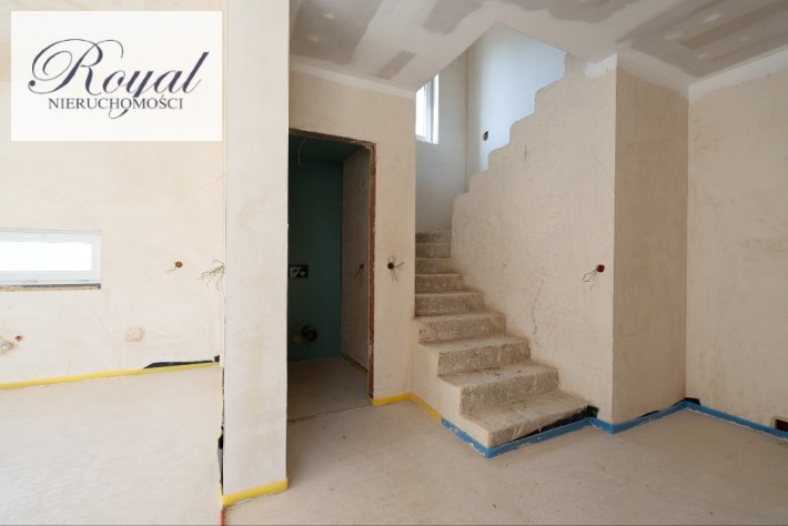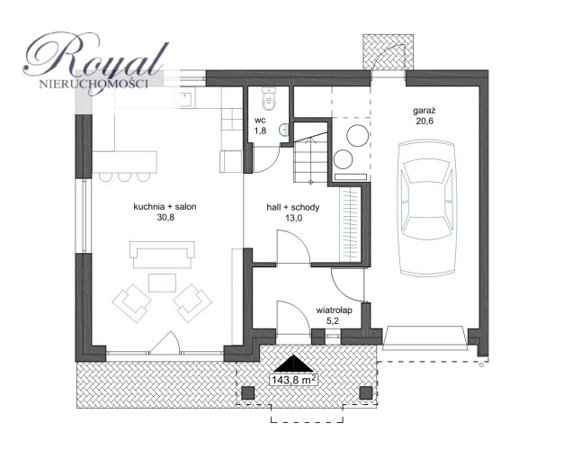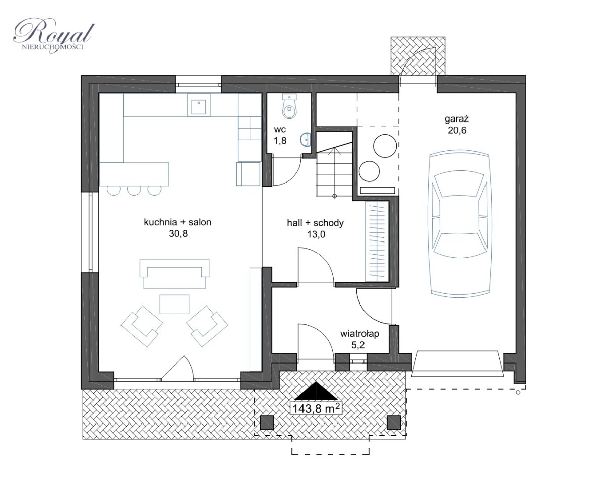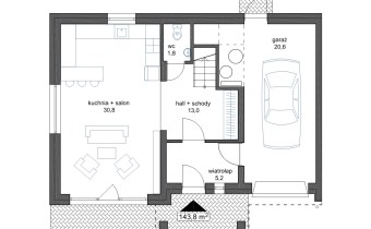 - Parter - przestronny salon z aneksem kuchennym i jadalnią, wiatrołap, hall + schody, wc, garaż