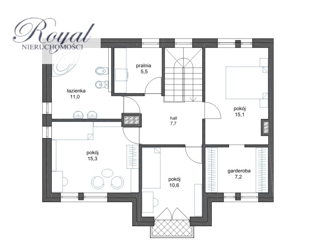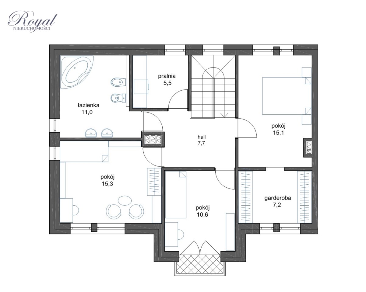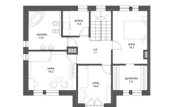 - Piętro - 3 sypialnie, w tym jedna z dużą garderobą, duża łazienka, pralnia