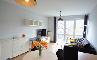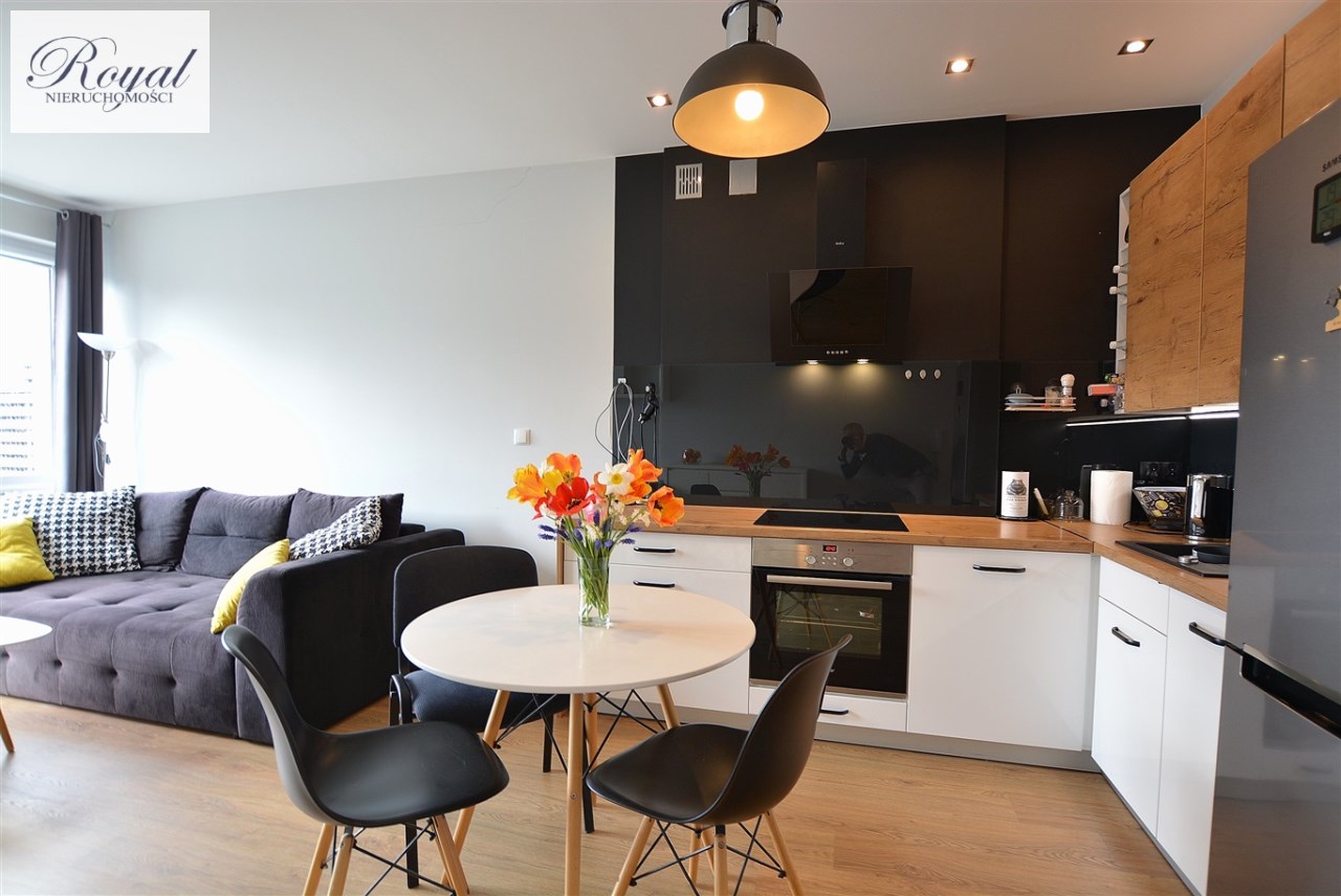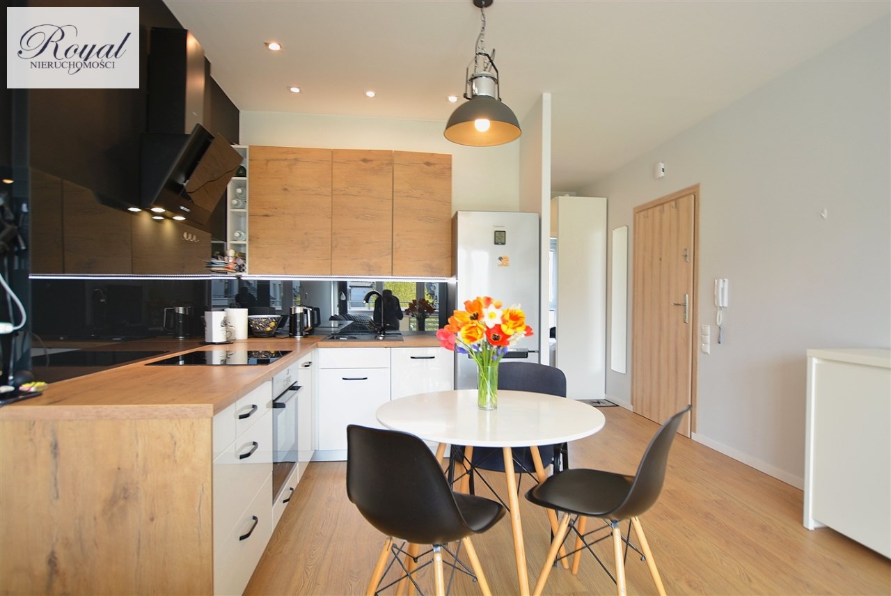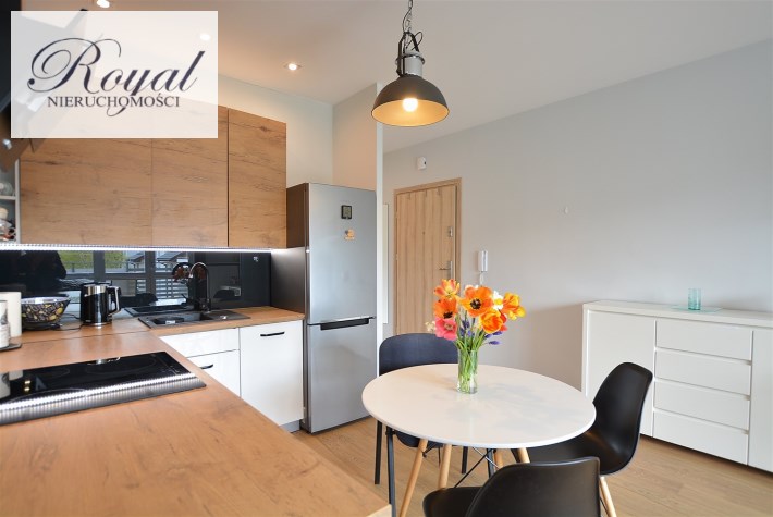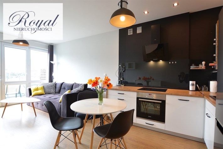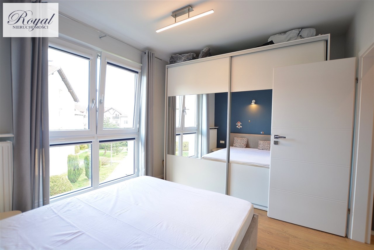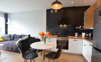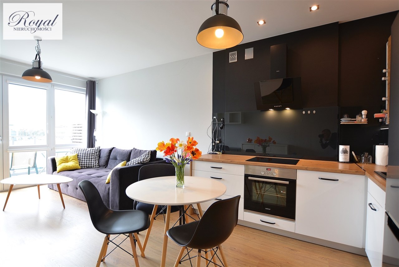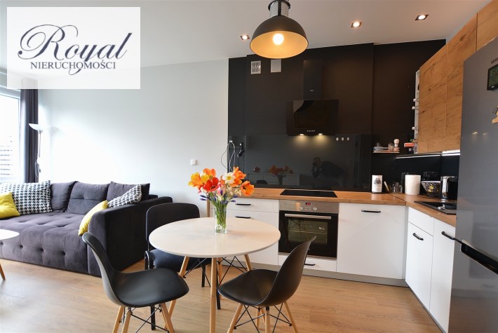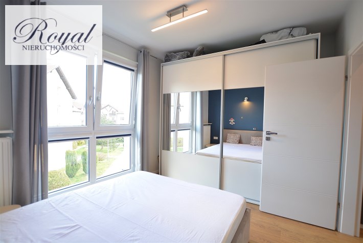 Nowoczesny apartament, wykończony z materiałów wysokiej jakości. Kuchnia w zabudowie wraz ze sprzętem AGD (zmywarka, lodówka, piekarnik, płyta grzewcza), w salonie komplet wypoczynkowy, w sypialni łóżko, oddzielna garderoba, w przedpokoju szafa zabudowana, w łazience kabina prysznicowa oraz pralka.