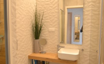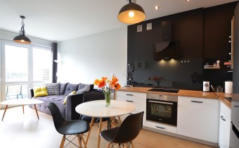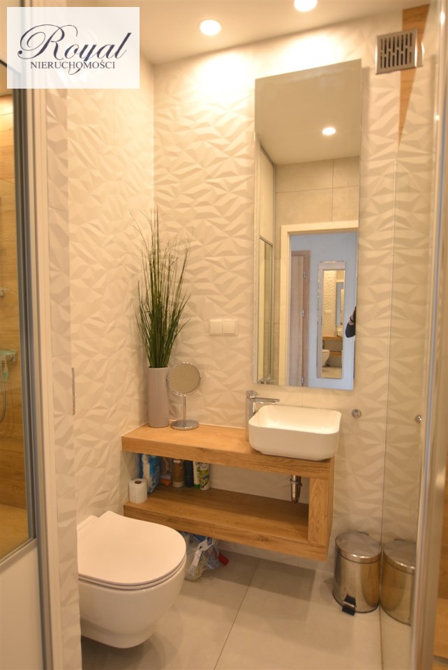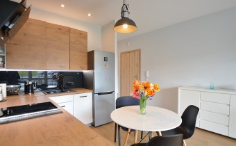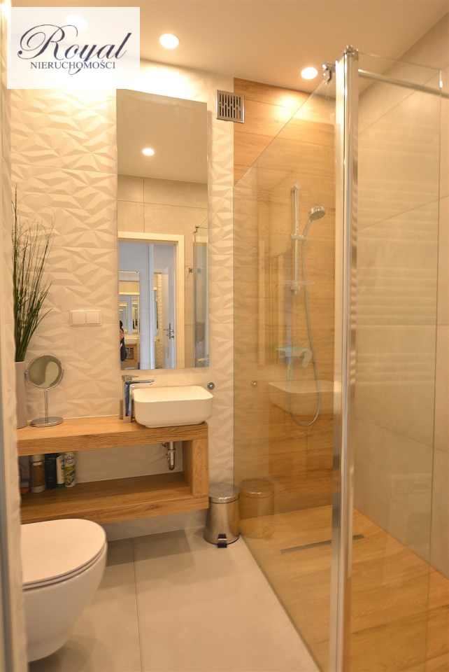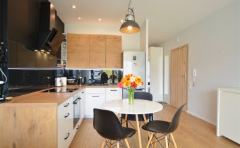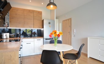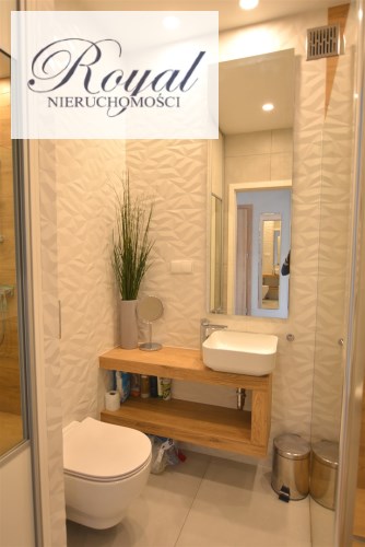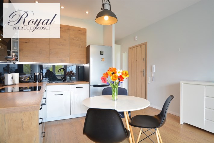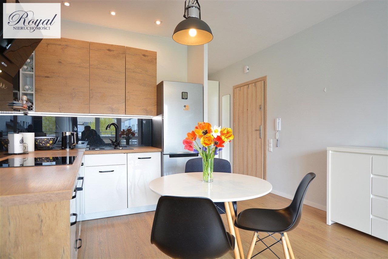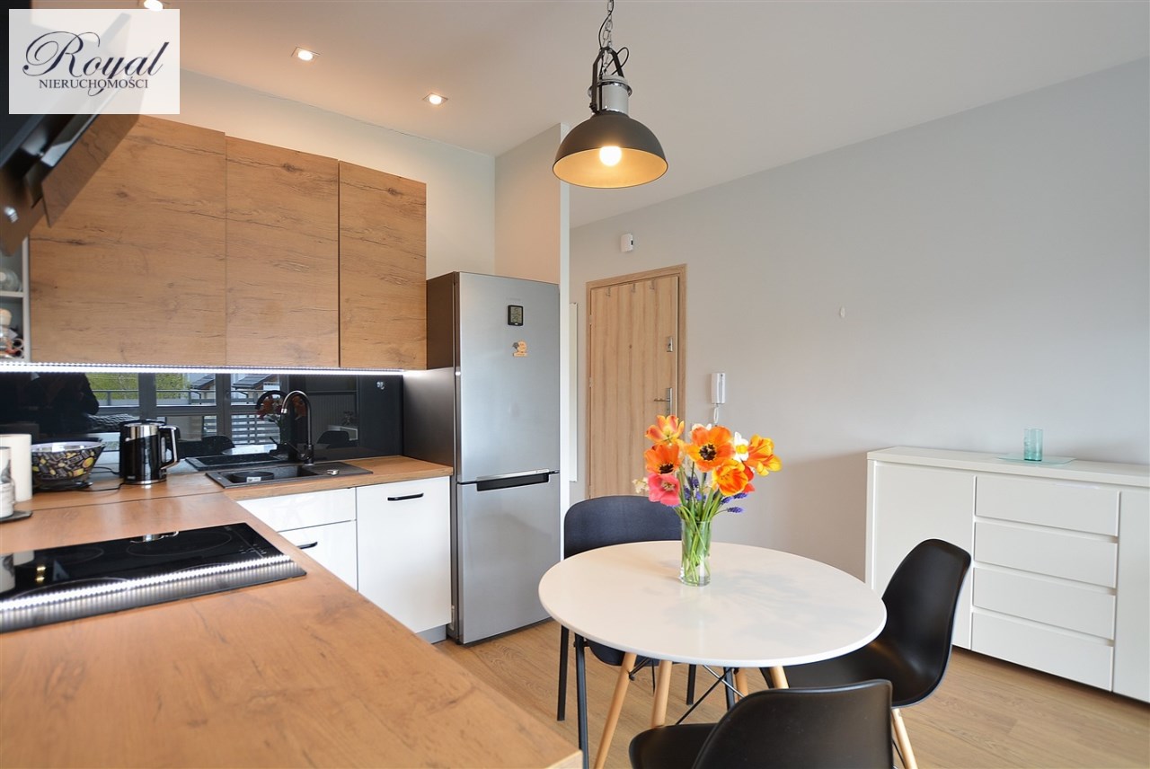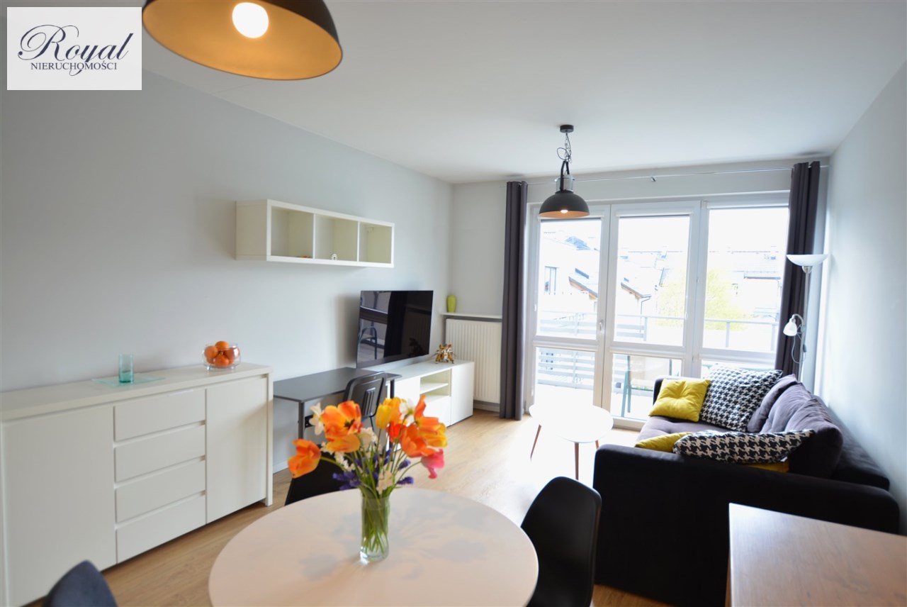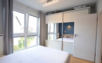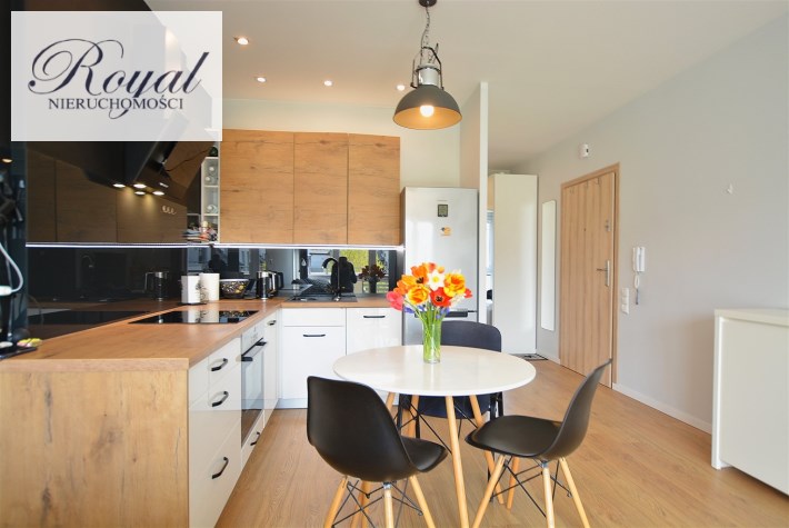 Nowoczesny apartament, wykończony z materiałów wysokiej jakości. Kuchnia w zabudowie wraz ze sprzętem AGD (zmywarka, lodówka, piekarnik, płyta grzewcza), w salonie komplet wypoczynkowy, w sypialni łóżko, oddzielna garderoba, w przedpokoju szafa zabudowana, w łazience kabina prysznicowa oraz pralka.